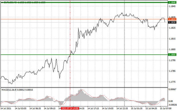 Продавать евро сегодня также можно в случае достижения цены 1.1838 и 1.1876, но в этот момент индикатор MACD должен находиться в области перекупленности, что ограничит восходящий потенциал пары и приведет к обратному развороту рынка вниз. Можно ожидать снижения к противоположному уровню 1.1819.