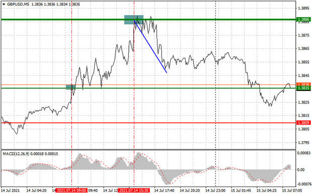По фунту вчера было образовано несколько сигналов по входу в рынок. Давайте посмотрим на график. Первый тест уровня 1.3835 произошел в момент, когда индикатор MACD уже достаточно много отдалился от нулевой отметки и прошел вверх. Поэтому сложно было входить в покупки против нисходящей тенденции, образованной за день до этого. Но, если вы купили фунт, то могли неплохо заработать. А вот во второй половине дня был просто отличный сигнал на продажу фунта от уровня 1.3886, где в момент обновления индикатор MACD находился в области перекупленности, что привело к такой существенной нисходящей коррекции пары.