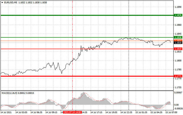 1876. В точке 1.1876 рекомендую выходить из рынка с прибылью и продавать евро сразу в обратную сторону (расчет на движение в 10-15 пунктов в обратную сторону от уровня). Рассчитывать на крупное движение евро вверх можно лишь по вновь образованному тренду, фундаментальной поддержки в первой половине дня не будет. Важно! Перед покупкой, убедитесь в том, что индикатор MACD находится выше нулевой отметки и только начинает свой рост от нее.Покупать евро сегодня также можно в случае достижения цены 1.1819 и 1.1773, но в этот момент индикатор MACD должен находиться в области перепроданности, что ограничит нисходящий потенциал пары и приведет к обратному развороту рынка вверх. Можно ожидать роста к противоположному уровню 1.1838.